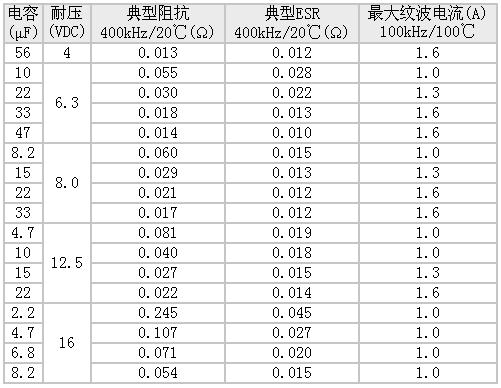 ESRD及ESRE兩個(gè)系列的電解電容具有極好的高頻特性,允許大的紋波電流,電容量允差±20%(精度為M級(jí)),等效串聯(lián)電阻ESR小,ESRD電容在100kHz時(shí)為10~45mΩ,ESRE電容在100kHz時(shí)低于10mΩ,400kHz、20℃時(shí)的阻抗為13mΩ到81mΩ,在使用溫度范圍內(nèi)阻抗幾乎不變,工作壽命長,小尺寸貼片式封裝,ESRD的尺寸為7.3mm(長)×4.3mm(寬)×1.8mm(高),而ESER系列的尺寸僅高度尺寸不同,高度為4.2mm,工作溫度為-55℃~+105℃。