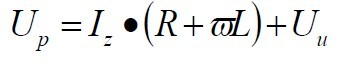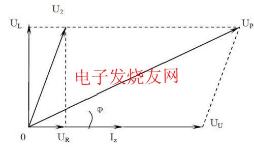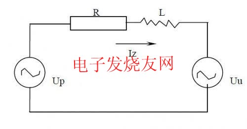 光伏發(fā)電并網(wǎng)運行時的電路原理如圖2所示。Up為逆變器輸出電壓,Uu為電網(wǎng)電壓,R為線路電阻,L為串聯(lián)電抗器,Iz則為回饋電網(wǎng)的電流。為保證回饋功率因數(shù)為1,回饋電流的相位必須與電網(wǎng)電壓的相位一致。以電網(wǎng)電壓Uu為參考,則Iz與Uu同相位,其矢量圖如圖3所示。內阻R兩端的電壓UR與電網(wǎng)電壓相位一致,而電抗器兩端電壓UL的相位則落后于UR90º.由此可以求得UP的相位和幅值: