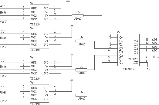由于在本設(shè)計(jì)中,采用單片機(jī)作為測(cè)量系統(tǒng)的核心,因此,控制電路的核心也采用單片機(jī),為了節(jié)約單片機(jī)的IO口,采用一片74LS175作為控制信號(hào)的鎖存器。驅(qū)動(dòng)電路與控制電路的接口電路如圖6所示。
