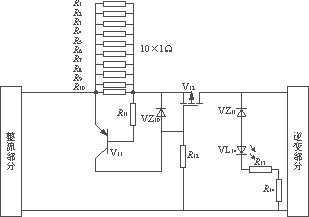 在圖8中,R1—R10為1Ω的標(biāo)準(zhǔn)電阻,功率為2W,當(dāng)電流超過(guò)預(yù)定值時(shí),在并聯(lián)電阻上的壓降超過(guò)0.7V,三極管導(dǎo)通,此時(shí),MOSFET將因柵源極間承受反向電壓而截止,從而切斷主電路;當(dāng)電流值正常時(shí),MOSFET正常導(dǎo)通,不會(huì)影響電路的正常工作。這種電路的缺點(diǎn)在于,如果電路中出現(xiàn)時(shí)斷時(shí)續(xù)的過(guò)電流時(shí),MOSFET將會(huì)不斷地動(dòng)作。為此,在圖3中還加入了其他保護(hù)元器件。