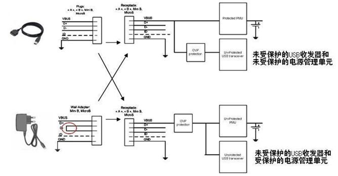 對一些交流-直流電源的基準(zhǔn)測試顯示出不良的線路穩(wěn)壓性能,而在存在光耦反饋(開關(guān)充電器)損耗的情況下更糟糕,輸出電壓可能升高至20V。 通過在設(shè)備前面設(shè)計過壓保護(hù)(OVP)器件,浪涌效應(yīng)和主機不盡責(zé)現(xiàn)象可以被消除。