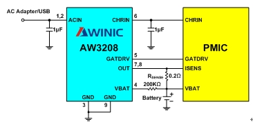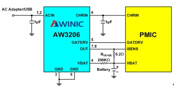 AW3206和AW3208的輸入引腳ACIN到地需要一個(gè)不小于1uF的輸入電容。這個(gè)輸入電容除了去耦外,還可以有效減小適配器在熱插拔時(shí)由于連接線的寄生電感效應(yīng)產(chǎn)生的瞬態(tài)過(guò)沖電壓。另外這個(gè)電容建議選取耐壓不低于15V的X7R或X5R陶瓷電容。