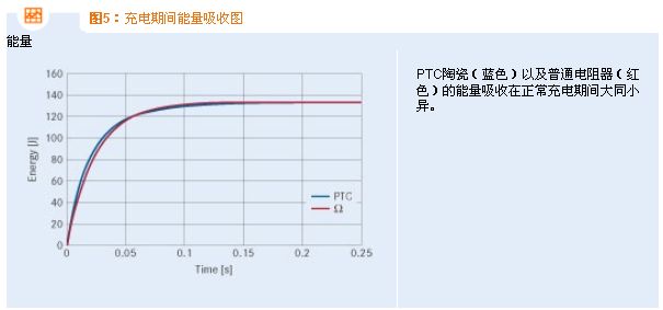 在短時(shí)間內(nèi),并聯(lián)的兩個(gè)自我防護(hù)式充電電阻器與外界達(dá)到熱平衡,同時(shí)由于PTC陶瓷的高電阻值,吸收的能量?jī)H有略微上升。最終產(chǎn)生的能量吸收與圖7所示類似。