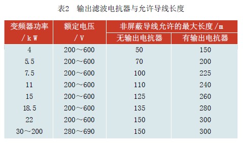 在變頻器的輸出側(cè)是否要配置電抗器,可根據(jù)工程實(shí)際情況而定。表2 是輸出濾波電抗器與允許導(dǎo)線長(zhǎng)度。