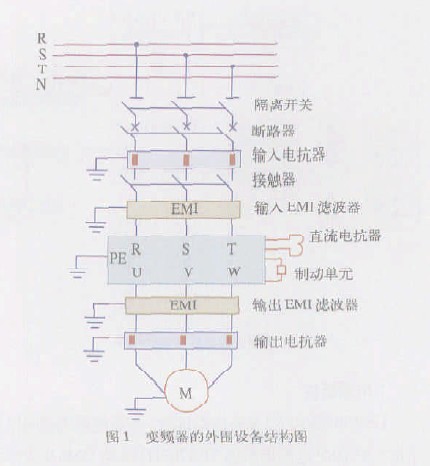 變頻器外圍保護(hù)設(shè)備的組成為了提高變頻器的工作性能,實(shí)現(xiàn)變頻器和電動(dòng)機(jī)的保護(hù),減少變頻器和周圍其他電氣設(shè)備的相互影響,在變頻器的輸入、輸出端配備的外圍保護(hù)設(shè)備如圖1 所示。