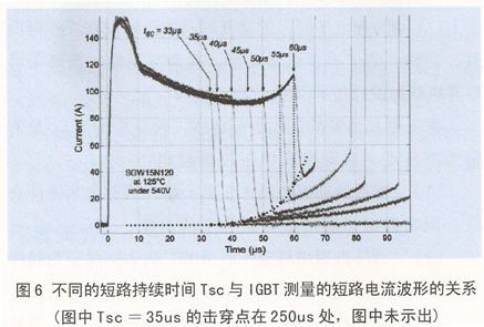 圖6給出不同短路續(xù)時間TSC,IGBT測量的短路電流波形。