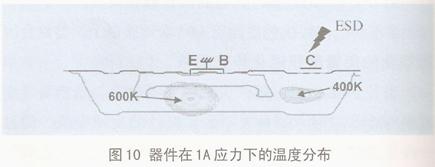 圖10是1A電流應力下,模擬顯示該器件有兩個熱點。一個在收集極觸點下,損傷電流IT2=1.52A;另一個熱點在發(fā)射極之下,用外推法算出的損傷電流遠大于2A。所以,首先出現(xiàn)導致失效的硅熔融點應在收集極。