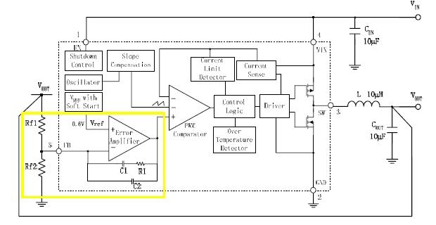 對于不同廠商設(shè)計的Buck變換器芯片,外圍電路所需要的器件會有所不同,這是因為芯片的集成度有差異,比如,有的廠商會把功率管集成在芯片內(nèi)部;有的廠商會把控制部分的補(bǔ)償網(wǎng)絡(luò)集成在芯片內(nèi)部。集成度越高的芯片,外圍電路所需要的器件就越少,因此對于客戶來說,外圍器件的選擇需要根據(jù)具體芯片來決定。然而,對于任何一個輸出可以調(diào)節(jié)的Buck變換器芯片,選擇合適的反饋電阻是必不可少的。圖2是BCD半導(dǎo)體公司的Buck變換器AP3406的典型應(yīng)用圖,由于該芯片集成度很高,外圍只需要輸入電容、輸出電感、輸出電容和反饋電阻,本文就以此為例對反饋電阻的作用做簡要分析,為如何選擇反饋電阻提供參考。
