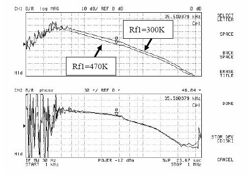 圖5和圖6是用網(wǎng)絡(luò)分析儀進(jìn)行AP3406環(huán)路增益測試的結(jié)果。由圖可以看出,當(dāng)Rf1從300k變化到470k,再變化到750k,系統(tǒng)的環(huán)路增益的幅頻特性不斷向下移動,同時相頻特性基本不變。于是系統(tǒng)的帶寬和相位裕度都有較大改變,測試結(jié)果如表1所示。