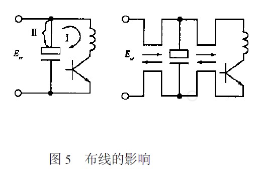 流過開關(guān)大電流的導(dǎo)線應(yīng)盡量短,并且不跟其它線交連。降壓型開關(guān)穩(wěn)壓電源的續(xù)流二極管或者升壓型的開關(guān)三極管的接地端應(yīng)以最短的引線直接與輸出電容的地端相連。圖5表示了布線的影響,尖峰干擾通過環(huán)路I輻射,故構(gòu)成這一環(huán)路的各段連線的感性耦合必須最小,電容器的引線要短,以減小引線電感。