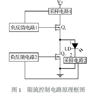 這是個雙限流電路,兩個限流電路確保通過激光二極管(LD)電流不會超過設(shè)定值。具體工作原理如圖1所示。