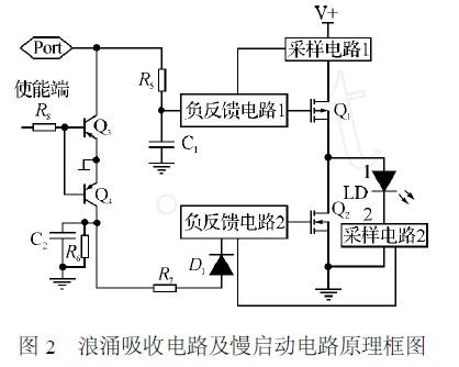 3)采用功率器件(MOS管)開通或關(guān)斷來強(qiáng)制吸收或隔離浪涌,防止浪涌對半導(dǎo)體激光器損壞。