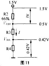 溫度傳感器采用NTC熱敏電阻RT,已知RT在0℃時(shí)阻值為333.1kΩ;5℃時(shí)阻值為258.3kΩ,則按1.5V工作電壓及流過(guò)R1、RT的電流約1.5 uA,可求出R1的值。R1的值確定后,可計(jì)算出0℃時(shí)的VA值為0.5V(按圖10中R1=665kΩ時(shí)),5℃時(shí)的VA值為0.42V,則VTHL=0.42V,VTHH=0.5V。若設(shè)R2=665kΩ,則按圖11,可求出流過(guò)R2、R3、R4電阻的電流I=(1.5V-0.5V)/665kΩ=0.0015mA,按R4×I/=0.42V,可求出R4=280kΩ再按0.5V=(R3+R4)0.0015mA, 則可求出R3=53.3kΩ。