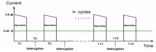 以磨制豆?jié){時(shí)的電流確定最大工作電流,根據(jù)該最大工作電流和最大環(huán)境溫度初步確定TE connectivity LVR系列PPTC的相關(guān)型號。圖5為多功能豆?jié){機(jī)磨制豆?jié){時(shí)的工作電流,測得多功能豆?jié){機(jī)的直流馬達(dá)的最大電流為800mA,由于磨制豆?jié){時(shí)馬達(dá)是間隔一定時(shí)間工作的,并不是一直連續(xù)工作的,間隔時(shí)間由豆?jié){機(jī)MCU計(jì)時(shí)電路控制,所以計(jì)算PPTC要能維持的最大工作電流指的是馬達(dá)工作整個(gè)周期的平均電流,圖中所示的800mA的最大電流換算成在一個(gè)完整工作周期內(nèi)為450mA。查閱LVR100在85度下的hold電流大約是550mA,所以首先選取LVR100。