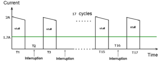 圖6為多功能豆?jié){機(jī)的堵轉(zhuǎn)電流。在榨水果的堵轉(zhuǎn)情況下,實(shí)測馬達(dá)的堵轉(zhuǎn)最大電流為2A,由于榨果汁時(shí)馬達(dá)也不是一直連續(xù)工作的,也是間隔一定時(shí)間工作,間隔時(shí)間是馬達(dá)工作6S,停3S,這樣換算成在一個(gè)榨水果完整工作周期內(nèi)平均電流是1.6~1.7A。在1.6~1.7A堵轉(zhuǎn)電流下,馬達(dá)堵轉(zhuǎn)需要保護(hù)的時(shí)間要求在150S內(nèi)。