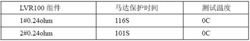 其次選取典型值電阻的LVR100和功率電阻集成的組件,來進(jìn)行0C/25C溫度下榨水果馬達(dá)堵轉(zhuǎn)保護(hù)時(shí)間,下表2為馬達(dá)的保護(hù)時(shí)間。