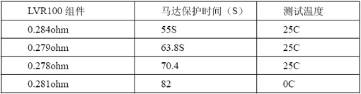選取兩片Rmin電阻0.22ohm 的LVR100和功率電阻集成的組件,下面表1為馬達(dá)的保護(hù)時(shí)間。