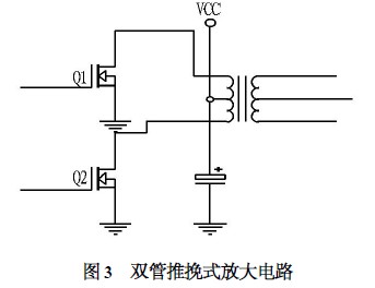 ( 3) 雙管推挽放大電路。圖3所示為雙管推挽放大電路。該方案采用了2 個(gè)MOS 管輪流導(dǎo)通,比采用4 個(gè)MOS管損耗低,而且輸出電壓比單端方式的要穩(wěn),為達(dá)到設(shè)計(jì)所需要的效率,本文選用了該方案。