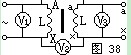 把初級(jí)線圈和次級(jí)線圈的一對(duì)同名端,例如Aa,用導(dǎo)線接起來,如圖38所示。然后在AX初級(jí)線圈間拉入交流電(比較低的便于測(cè)量的)。用電壓表分別測(cè) 量AX間電壓V1值,XX間電壓V2值,以及ax間電壓V3值。如果V2數(shù)值是V1與V3電壓之差,則Aa是同極性端,如果V2數(shù)值是V1與V3電壓之和,則AX是同極性端。