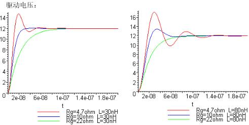 可以看到當Rg比較小時驅(qū)動電壓上沖會比較高,震蕩比較多,L越大越明顯,此時會對MOSFET及其他器件性能產(chǎn)生影響。但是阻值過大時驅(qū)動波形上升比較慢,當MOSFET有較大電流通過時會有不利影響。
