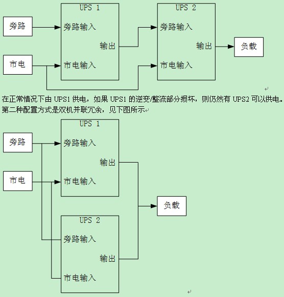 對于一般的UPS系統(tǒng)應(yīng)用來說,存在兩種常見的配置方式,一種是雙機熱備份,見下圖所示