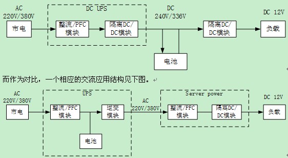 在UPS應(yīng)用的另外一個分支是目前正在興起的直流UPS系統(tǒng)。直流系統(tǒng)的思路是出于提高效率的目的,減少電源系統(tǒng)中間的轉(zhuǎn)換環(huán)節(jié),電力分配部分由原來的交流轉(zhuǎn)換成直流。一個理想的直流UPS系統(tǒng)服務(wù)器應(yīng)用從市電到12V終端的應(yīng)用結(jié)構(gòu)見下圖。