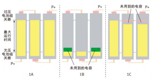 在鋰離子電池組中,存在一些允許每節(jié)串聯(lián)電池達到的預(yù)定義電壓最小值和最大值。這是一種由電池組中IC控制的安全特性,請參見圖1A。只要每一節(jié)電池均保持在過壓和欠壓斷開范圍之間,則該電池組便能夠放電和充電。如果一節(jié)電池達到上述任何一個閾值,則整個電池組便會關(guān)閉(欠壓),從而讓主機本應(yīng)可用的電池組處于無法充電狀態(tài)(請參見圖1B)。另外,它不允許充電器向電池組充入應(yīng)有的大量能量(請參見圖1C)(過壓)。