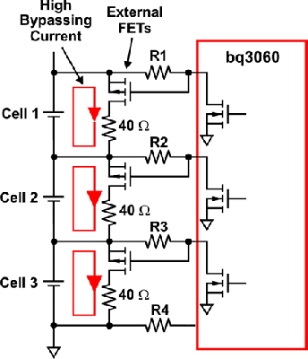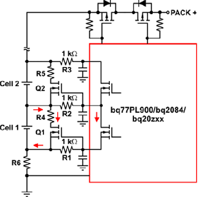 由于使用集成FET解決方案的無源電池平衡技術(shù)的平衡能力有限,因此電池差異或失衡率可能超過電池平衡。另外,由于存在低旁路電流,它可能會占用幾個周期來對一般失衡進行校正。利用現(xiàn)有組件設(shè)計一些外部旁路電路可以增強電池平衡(請參見圖6和圖7)。在圖6中,當(dāng)決定對某節(jié)電池進行平衡時內(nèi)部平衡MOSFET首先開啟。這便形成一條低電流通路,其通過連接電池端(電池1和電池2)及IC引腳的外部濾波器電阻。當(dāng)內(nèi)部FET柵-源電壓在電阻中形成,該外部MOSFET便被開啟。其缺點是,鄰近電池?zé)o法快速、同時獲得平衡。例如,如果鄰近內(nèi)部FET被開啟,則Q2不能被開啟,因為沒有通過R2的電流。