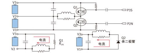 電池組設(shè)計人員設(shè)定串聯(lián)電池之間的失衡閾值。如果IC測量到超出該閾值的失衡,它就會啟用PowerPump。圖8顯示的是使用了兩個MOSFET(Q1和Q2)及一個功率電感的降壓升壓電路簡圖。頂部電池(V3)需要將能量轉(zhuǎn)移至低位電池(V2),P3S信號(工作在約200kHz和30%占空比下)觸發(fā)該能量轉(zhuǎn)移,隨后能量通過Q1流至電感。當(dāng)P3S信號重置時,Q1關(guān)閉,電感能量水平處在最高水平。因為電感電流必須不斷流動,因此Q2的體二極管被正向偏置,從而完成向V2位置電池的電荷轉(zhuǎn)移。需要注意的是,由于其串聯(lián)電阻較低,存儲于該電感中的能量只有輕微的損耗。