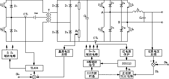 再經(jīng)過全橋DC/AC逆變電路,得到220V/50Hz交流電壓輸出。為保證系統(tǒng)可靠運(yùn)行,防止主電路對(duì)控制電路的干擾,采用主、控電路完全隔離的方法,即驅(qū)動(dòng)信號(hào)用光耦隔離,反饋信號(hào)用變壓器隔離,輔助電源用變壓器隔離等。