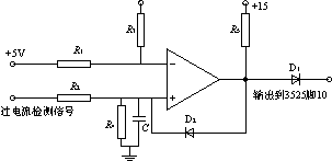 過電流保護(hù)采用電流互感器作為電流檢測(cè)元件,其具有足夠快的響應(yīng)速度,能夠在IGBT允許的過流時(shí)間內(nèi)將其關(guān)斷,起到保護(hù)作用。如圖1所示,過流保護(hù)信號(hào)取自CT2,經(jīng)分壓、濾波后加至電壓比較器的同相輸入端,如圖4所示。當(dāng)同相輸入端過電流檢測(cè)信號(hào)比反相輸入端參考電平高時(shí),比較器輸出高電平,使D2從原來的反向偏置狀態(tài)轉(zhuǎn)變?yōu)檎驅(qū)?,并把同相端電位提升為高電平,使電壓比較器一直穩(wěn)定輸出高電平。同時(shí),該過電流信號(hào)還送到SG3525的腳10。當(dāng)SG3525的腳10為高電平時(shí),其腳11及腳14上輸出的脈寬調(diào)制脈沖就會(huì)立即消失而成為零。
