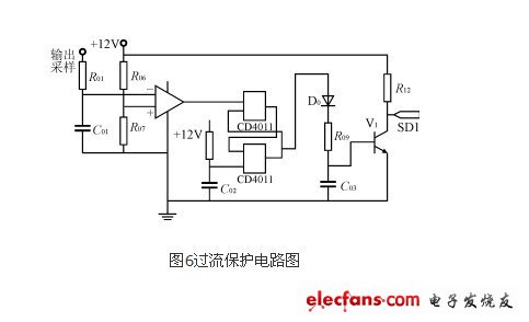 過流保護電路如圖6所示,它監(jiān)測輸出電流狀況,預設為1.5A。方波逆變器的輸出電流經過采樣進入運算放大器的反向輸入端,當輸出電流大于1.5A后,運算放大器的輸出端跳轉為負,經過 CD4011組成的R-S觸發(fā)器后,使三級管V1基級的信號為低電平,三級管截止,向IR2011的SD1端輸出高電平,達到保護的目的。