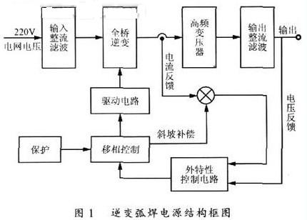 220V交流市電經(jīng)整流濾波后做為全橋逆變器的直流輸入,其輸出為脈寬可調(diào)的高頻交流電壓方波,通過高頻變壓器隔離降壓后,再經(jīng)過輸出整流濾波得到滿足焊接要求的直流電源。