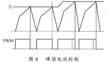 在本方案所采用的峰值電流控制模式下,腳19(RAMP)端的鋸齒波信號是從變壓器原邊的電流信號經(jīng)采樣整流得到的。但由于實際上原邊電流信號波形上升斜率較緩,與給定比較時,容易因為干擾或毛刺抖動產(chǎn)生誤動作。因此實際應(yīng)用時,先將原邊電流的采樣整流值與芯片定時電容CT上的鋸齒波相疊加,經(jīng)過斜坡補償后,再送入腳19(RAMP)端進(jìn)行比較控制。峰值電流控制過程如圖4所示。