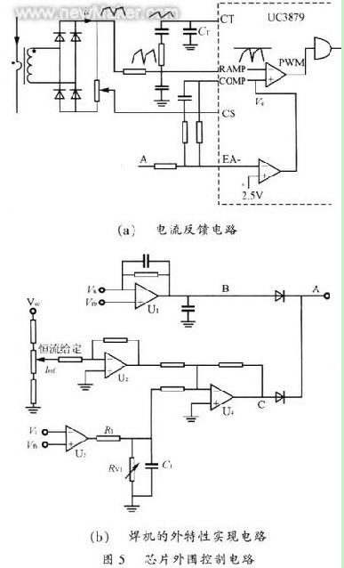 (2)外拖特性實現(xiàn) 正常工作時,輸出電壓反饋值Vfb大于外拖給定值Vz,比較器U3的輸出為零,對加法器U4沒有影響,焊接電流由恒流給定值Iref決定;當(dāng)焊槍與工件粘連短路時,Vfb小于VZ,比較器U3的輸出為高,相當(dāng)于給增大了Iref,UC3879內(nèi)部誤差放大器的輸出Ve也增大,焊接電流則隨之增大,從而實現(xiàn)外拖。