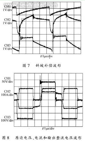 圖7為電流斜坡補償波形。通道3為原始電流采樣波形;通道1為用于補償?shù)匿忼X波;通道2為補償后波形。補償后斜率明硅增加。 圖8所不為原邊電壓(通道3)、原邊電流(通道2)和輸出整流電壓(通道1)波形。從圖8中可清楚地看出占空比損失。