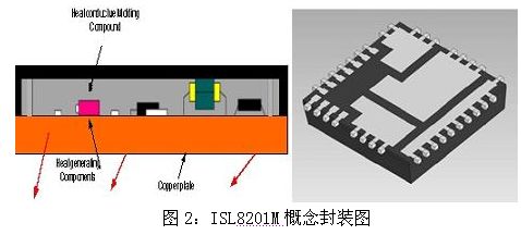 Intersil的ISL8201M模塊集成了一個完整的DC/DC轉(zhuǎn)換器所需的大多數(shù)組件,包括PWM控制器、MOSFET和電感器。其輸入電壓范圍為3-20V,電流能力為10A。它可實現(xiàn)比傳統(tǒng) SIP DC/DC模塊高得多的開關(guān)頻率,通過不使用MOSFET封裝并將這些組件共同封裝在一個緊湊的15×15×3.5mm的QFN封裝中(見圖2),實現(xiàn)了極佳的效率和熱性能。ISL8201M是一個系列模塊中的第一個產(chǎn)品,尺寸和性能的進一步改善正在開發(fā)當中。