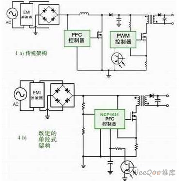 在這類可能需要采用PFC控制器的應(yīng)用中,傳統(tǒng)的解決方案是PFC控制器+PWM控制器的兩段式方案。這種方案支持模塊化,且認(rèn)證簡單,但在總體能效方面會(huì)有折衷,如假設(shè)交流-直流(AC-DC)段的能效為87%至90%,直流-直流(DC-DC)段能效為85%至90%,則總能效僅為74%至81%。隨著LED技術(shù)的持續(xù)改進(jìn),這種架構(gòu)預(yù)計(jì)將轉(zhuǎn)化為更加優(yōu)化、更高能效的方案。根據(jù)要求的不同,有多種可供選擇的方案,如:PFC+非隔離降壓、PFC+非隔離反激或半橋LLC、NCP1651/NCP1652單段式PFC方案。