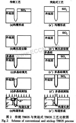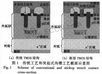 當(dāng)相鄰單位元胞尺寸不斷縮小后,尤其在設(shè)計柵極氧化膜較薄的器件時,在傳統(tǒng)的TMOS工藝中,源區(qū)注入會穿透柵極側(cè)壁影響器件性能。采用突起式結(jié)構(gòu)可以有效地避免刻蝕工藝及源區(qū)注入對較短溝道器件的間接影響,消除了器件穿通的風(fēng)險,保證了器件的穩(wěn)定性能和可重復(fù)性。