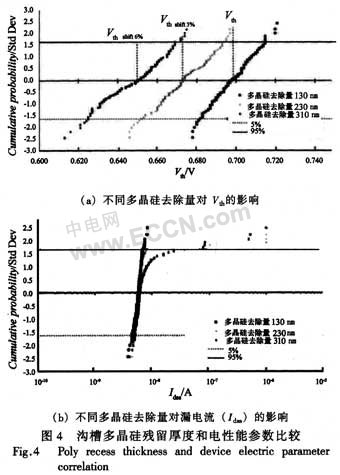 當(dāng)單位元胞相鄰間距為1.4 μm工藝時,由于設(shè)計的溝道長度大約為0.5μm,源區(qū)結(jié)深大致為0.3μm,不得不考慮到傳統(tǒng)工藝下源區(qū)注入時,多晶硅刻蝕工藝波動所帶來的器件性能下降的風(fēng)險。在傳統(tǒng)工藝中,當(dāng)多晶硅淀積完成后,須通過刻蝕來形成柵極區(qū)域,但是多晶硅去除量難以精準(zhǔn)控制,同時考慮到刻蝕工藝面內(nèi)均勻性的特點,Si片內(nèi)中心與邊緣的去除量無法保證相同,從而為隨后的源區(qū)注人工藝留下了潛在的風(fēng)險。如圖2傳統(tǒng)TMOS與突起式TMOS工藝比較圖2(e)所示,當(dāng)源區(qū)注入時,如果柵極多晶硅刻蝕量過多,會導(dǎo)致源區(qū)高濃度的As+離子從柵極邊緣注入到溝道中,間接地減少了溝道長度,從而降低了閾值開啟電壓(Vth),尤其當(dāng)溝道長度較短時,甚至?xí)?dǎo)致器件在正常工作狀態(tài)時發(fā)生漏源間穿通效應(yīng),最終導(dǎo)致器件失效。本文采用K·Shenai的突起式結(jié)構(gòu),在形成溝槽之后,先保留之前所生長的氧化層,然后直接生長柵極氧化膜和多晶硅,在柵極多晶硅形成后,才將先前生長的氧化層去掉,由此便形成了突起式多晶硅結(jié)構(gòu),從而可以保證在隨后的源區(qū)As+離子注入時,As+離子無法從溝槽側(cè)壁注入到溝道中,從根本上避免了發(fā)生源漏極之間穿通的可能性,降低了器件對刻蝕工藝的依賴程度。這點在器件柵極氧化膜厚度較薄的情況下尤其明顯,此時如果采用傳統(tǒng)工藝,源區(qū)離子注入時,As+離子更容易從側(cè)壁注入到溝道中,從而影響溝道長度。