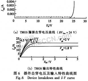 為了驗證這一理論,特別設(shè)計了在傳統(tǒng)工藝下,柵極頂部到外延層表面的多晶硅去除量(130 nm/230 nm/310 nm)的試驗。通過器件的電性能參數(shù)比較,如圖4(a)所示,可以看到,隨著多晶硅去除量的增加,閾值開啟電壓隨之降低,說明了器件溝道有效長度變短,源區(qū)離子通過側(cè)壁注入到溝道中,源區(qū)結(jié)深在溝道表面變深。同時由圖4(b)可知,漏源間漏電流也有明顯的區(qū)別,當(dāng)多晶硅去除量在310 nm時,從累積概率圖中可以看到有部分區(qū)域漏電流增大,這一現(xiàn)象隨著多晶硅去除量的減少而逐步消失,從而驗證了溝道有效長度與多晶硅去除量有很強的相關(guān)性。由此可見,為了減少器件性能與刻蝕工藝的相關(guān)性,采用突起式多晶硅技術(shù)是非常必要的。圖5是采用透射電子顯微鏡所得到的突起式TMOS實際截面圖??梢钥吹皆谠搱D中的突起式多晶硅結(jié)構(gòu)以及溝槽式接觸,單位元胞相鄰間距為1.4μm的n型TMOS,單個芯片有源區(qū)面積為0.4 nm2,并采用TSOP6封裝。圖6(a)、(b)分別是器件擊穿電壓曲線以及輸出特性曲線。由圖6(a)可以看到,當(dāng)漏端漏電流為250μA時,擊穿電壓為24 V,滿足大于20 V的設(shè)計需要,由圖6(b)可以看到,當(dāng)柵極開啟電壓為4.5 v、工作電流為5 A時,對應(yīng)的導(dǎo)通電阻大致為23.75 mΩ。由于芯片有源區(qū)設(shè)計尺寸為0.4 mm2,最終Rdson·A為9.5 mΩ·mm2
