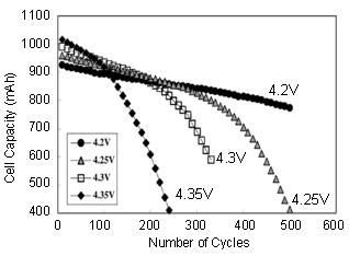 圖 4:LiCoO2 陰極鋰離子電池的充電電壓和使用壽命之間的關(guān)系