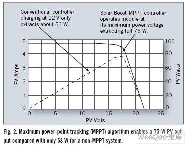 未采用MPPT算法的逆變器簡(jiǎn)單地將光伏模塊與電池直接連接起來(lái),迫使光伏模塊工作在電池電壓。幾乎無(wú)一例外的是,電池電壓不是采集最多可用太陽(yáng)能的理想值。