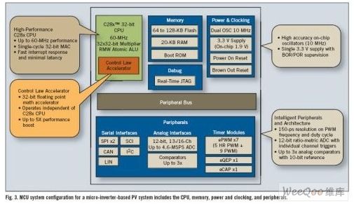 圖3 面向基于微逆變器PV的系統(tǒng)的MCU系統(tǒng)包含CPU、存儲(chǔ)器、電源及時(shí)鐘、外設(shè)