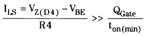 電容C4和二極管D3對驅(qū)動電路的功能至關(guān)重要。通過選擇電阻R5來將12V柵極驅(qū)動電平設(shè)置在整流器輸出電壓以下。二極管D3將電容C4限定在這一電平。特別是,當U1的開關(guān)引腳輸出一個低信號來開啟功率FET時,信號被電平位移到Q3的基極。晶體管Q3開啟,并快速地將Q4的柵—源電容CGS充電至 12V。如果沒有C4和D3的話,關(guān)閉Q4會讓Q3成為一種漏極接地的昂貴的高壓雙極型晶體管。當U1的開關(guān)引腳輸出一個高信號來關(guān)閉功率FET時,該信號被電平位移至Q2的基極。Q2開啟,有效地將Q4的柵極與輸入電壓連接。在沒有起到本地電源作用的電容C4的情況下,晶體管Q2和Q3無法提供快速(且因此而高效地)上拉或下拉Q4柵極電容所必需的快速電流峰值,注意到這一點很重要。另外,由R4設(shè)定的電平位移器電流ILS必須足夠高,以在ton(min) 期間移動Q4的柵極電荷QGate。也就是說: