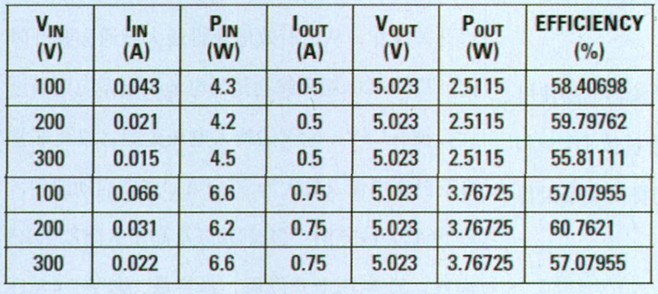 電容C4值設(shè)定大于Q4的柵極電容,但其必須足夠小,以便在更短控制器最小導通與斷開時間期間能夠得到再充電。圖3顯示了300V和500mA負載輸入電壓下,一個開關(guān)周期的柵極和漏極導通/斷開時間。表1顯示了測得的轉(zhuǎn)換效率。