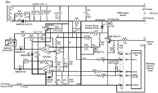 利用這個(gè)電路可以實(shí)現(xiàn)具有PWM調(diào)光輸入和可選調(diào)光卡的30 Vout LED驅(qū)動(dòng)器CVCC次級(jí)檢測。