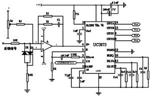 PWM移相控制是通過(guò)UC3875的誤差放大器來(lái)實(shí)現(xiàn)的,在UC3875的4角上接PI調(diào)節(jié)器,利用電壓傳感器將輸出電壓與給定基準(zhǔn)電壓相比較,從而控制A、B與C、D之間的相位,最終調(diào)整波形占空比,使電源穩(wěn)定在預(yù)定值上。A/B、D/C兩個(gè)半橋,可單獨(dú)進(jìn)行導(dǎo)通延時(shí)(即死區(qū)時(shí)間)的控制,在該死區(qū)時(shí)間內(nèi)確保下一個(gè)功率開(kāi)關(guān)器件的輸出電容放電完畢,為即將導(dǎo)通的開(kāi)關(guān)器件提供電壓開(kāi)通條件。圖3所示是本設(shè)計(jì)的控制電路圖。