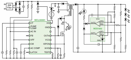 NCL30001是一種單段拓?fù)浣Y(jié)構(gòu)LED驅(qū)動(dòng)方案,其靈活的特性非常適合應(yīng)用于新的LED照明產(chǎn)品,其他規(guī)格特性還包括高壓?jiǎn)?dòng)電路、電壓前饋以改善環(huán)路響應(yīng)、輸入欠壓檢測(cè)、內(nèi)部過(guò)載定時(shí)器、閂鎖輸入,以及減少輸入線路諧波的高精度乘法器。這種方案采用連續(xù)導(dǎo)電模式(CCM)工作,集成了PFC和隔離型DC-DC轉(zhuǎn)換電路,并提供恒定電流來(lái)直接驅(qū)動(dòng)LED,相當(dāng)于將AC-DC轉(zhuǎn)換與LED驅(qū)動(dòng)兩部分電路整合在一起,均位于照明燈具內(nèi),省去了LED光條中集成的線性或DC-DC轉(zhuǎn)換器。這種整體式方案的電源轉(zhuǎn)換段更少,減少元器件使用數(shù)量(如光學(xué)元件、LED、電子元件及印制電路板等),降低系統(tǒng)成本,并支持更高的LED電源總體能效。當(dāng)然,這種方案的功率密度更高,可能并不適合所有區(qū)域照明應(yīng)用,其光學(xué)圖案可能更適合較低功率的LED,典型應(yīng)用包括LED街燈、外墻燈、洗墻燈及電冰箱箱體照明等。