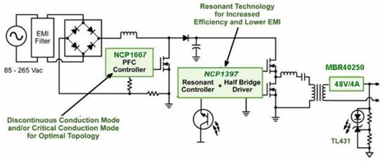 LLC拓?fù)浣Y(jié)構(gòu)采用串聯(lián)類型的諧振轉(zhuǎn)換器,能在相對(duì)寬的輸入電壓和輸出負(fù)載范圍下工作。此外,由于諧振儲(chǔ)能元件可以部分或完全集成在主變壓器中,LLC拓?fù)浣Y(jié)構(gòu)只需要數(shù)量有限的元器件。再加上在所有負(fù)載條件下,LLC拓?fù)浣Y(jié)構(gòu)的初級(jí)開(kāi)關(guān)都能工作在零電壓開(kāi)關(guān)條件,次級(jí)整流器都能工作在零電流開(kāi)關(guān)條件。所以,LLC拓?fù)浣Y(jié)構(gòu)是高性價(jià)比、高能效及優(yōu)化了電磁干擾的解決方案。